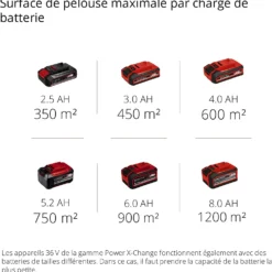 Équipée de la technologie Power X-Change Einhell, la tondeuse est munie de 2 puissantes batteries rechargeables lithium-ion de 18 V et 4.0Ah pouvant être employées de façon interchangeable avec n’importe quel autre appareil à batterie de la gamme.