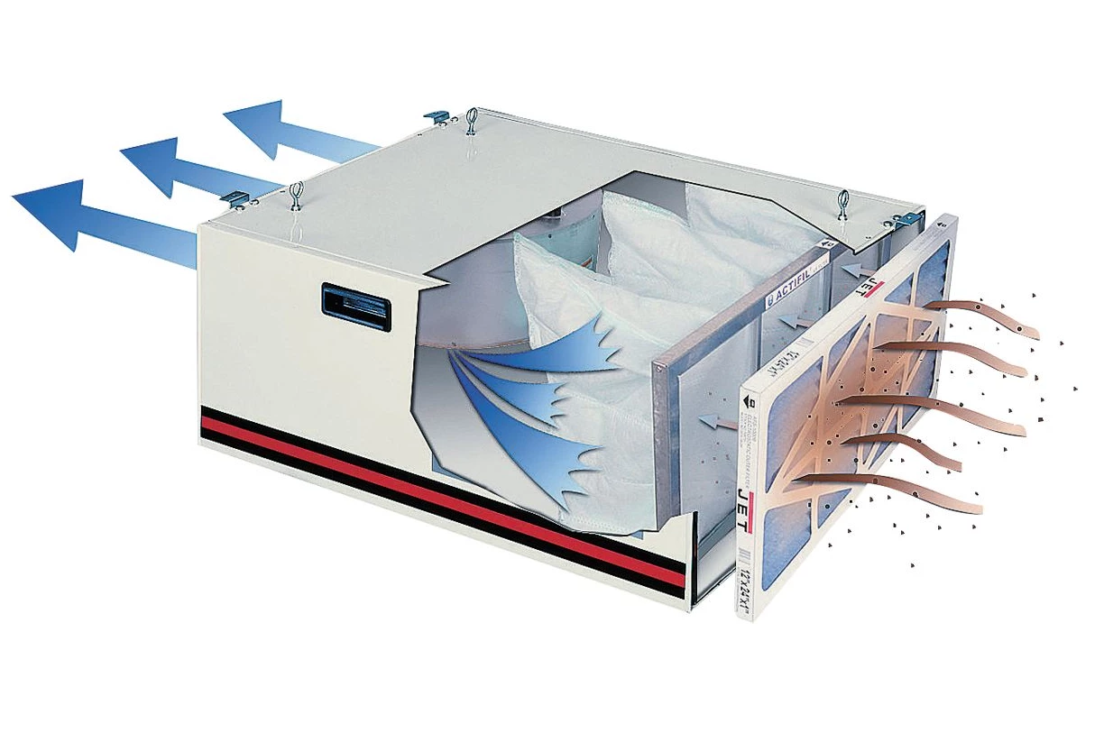 Nettoyage et filtrage silencieux de l’air dans votre atelier pendant le travail, filtre 98% de toutes les poussières jusqu’à 5 microns et 85% de toutes les particules d’un micron.