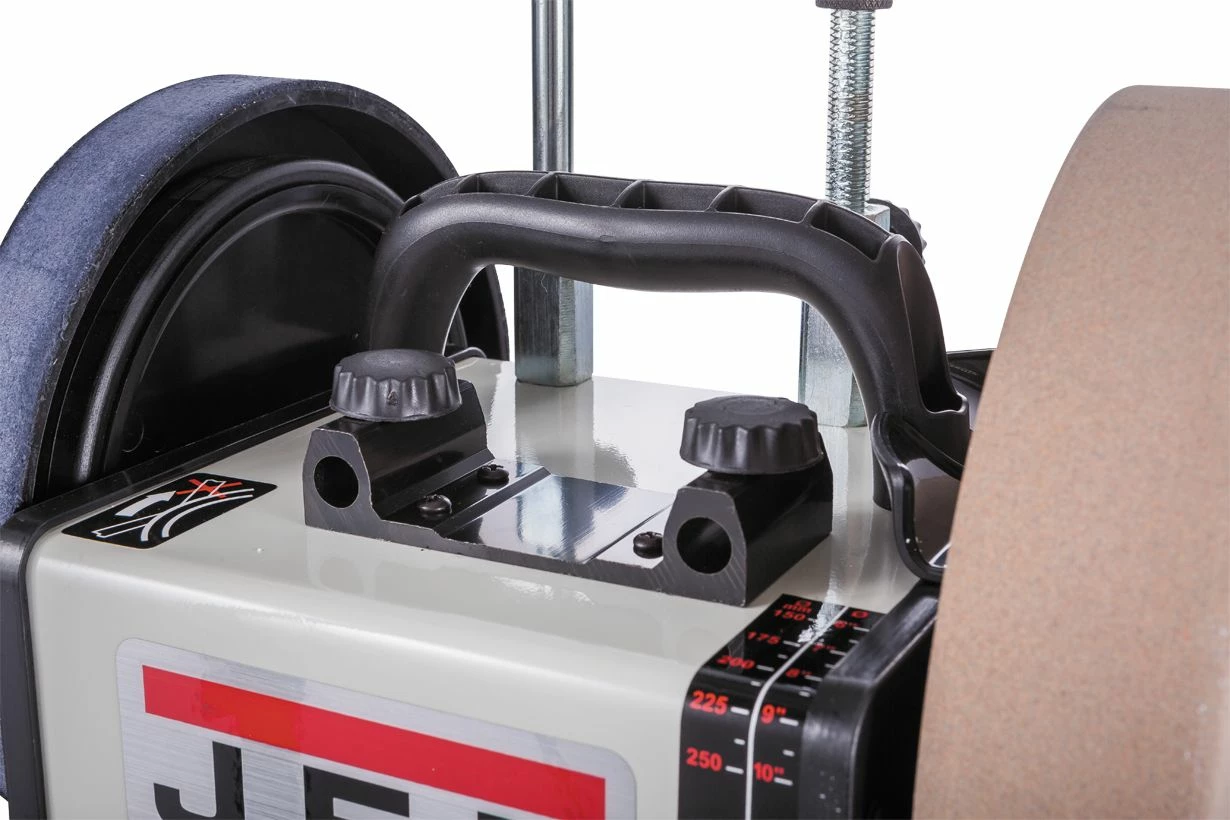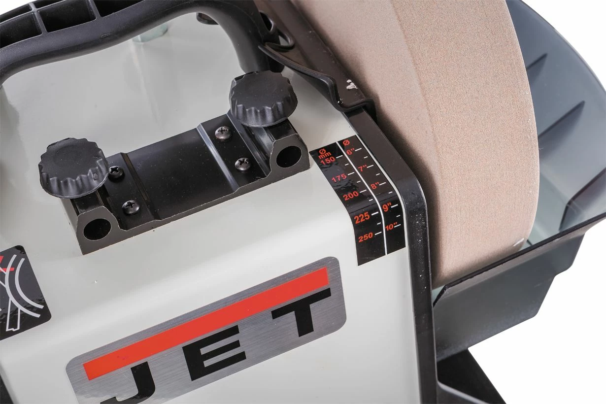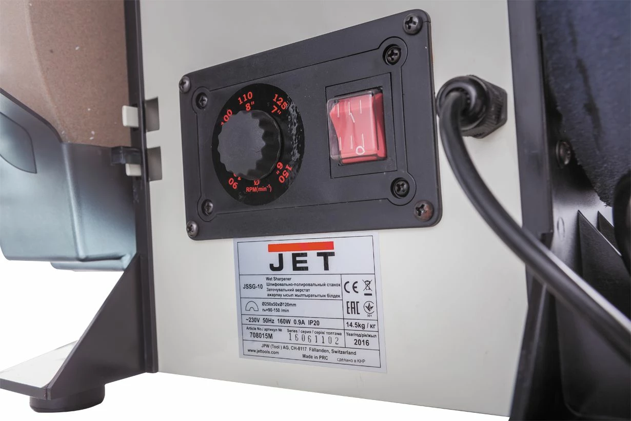 - Le touret d’affûtage à eau JET JSSG-10-M est équipé d’une meule de Ø 250 x 50mm, offrant une performance optimale pour l’affûtage des outils en bois et en métal.