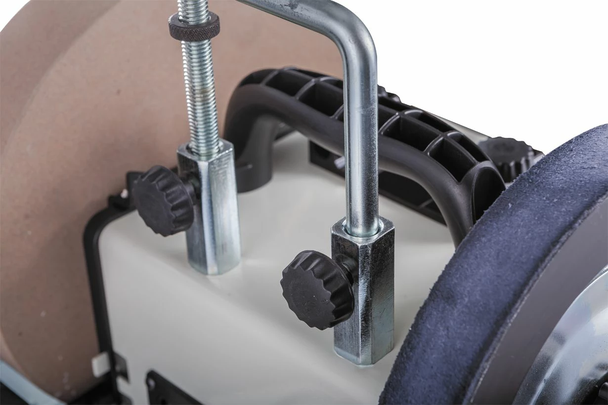 - Le système d’affûtage à eau permet de maintenir la température de la meule basse, évitant ainsi la surchauffe et préservant la qualité de votre travail.