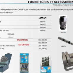 - L’arbre porte-mandrin CM2-B18, un mandrin auto-serrant B18, un chasse-cône, un étau de serrage avec mors de 100mm, clés et notice d’utilisation.