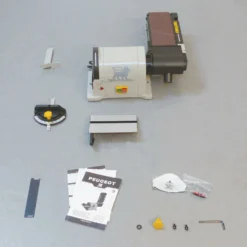 - Table du disque de ponçage (195 x 136 mm) inclinable à 45° avec guide d’angle pour le ponçage des angles composés