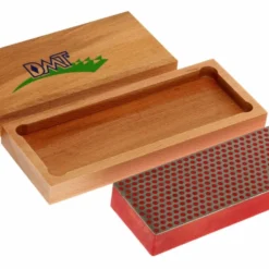 Pierre à aiguiser à la surface d’aiguisage diamantée pourvue du motif à pois caractéristique de DMT. Cette pierre a un grain fin. Cette pierre à aiguiser est livrée dans un boîtier en bois pourvu de pieds antidérapants.