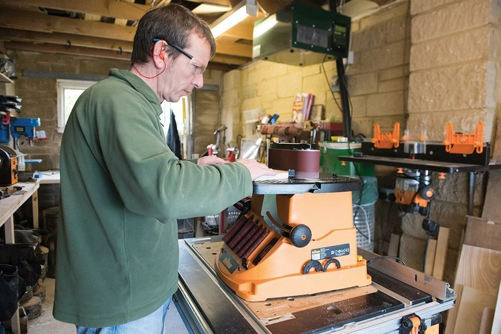 - Un système de butée vissable sur la table fixe contre la bande permet de travailler finement les extrémités et pièces courtes
