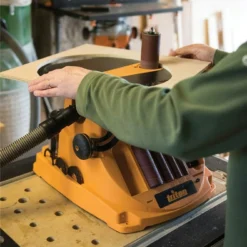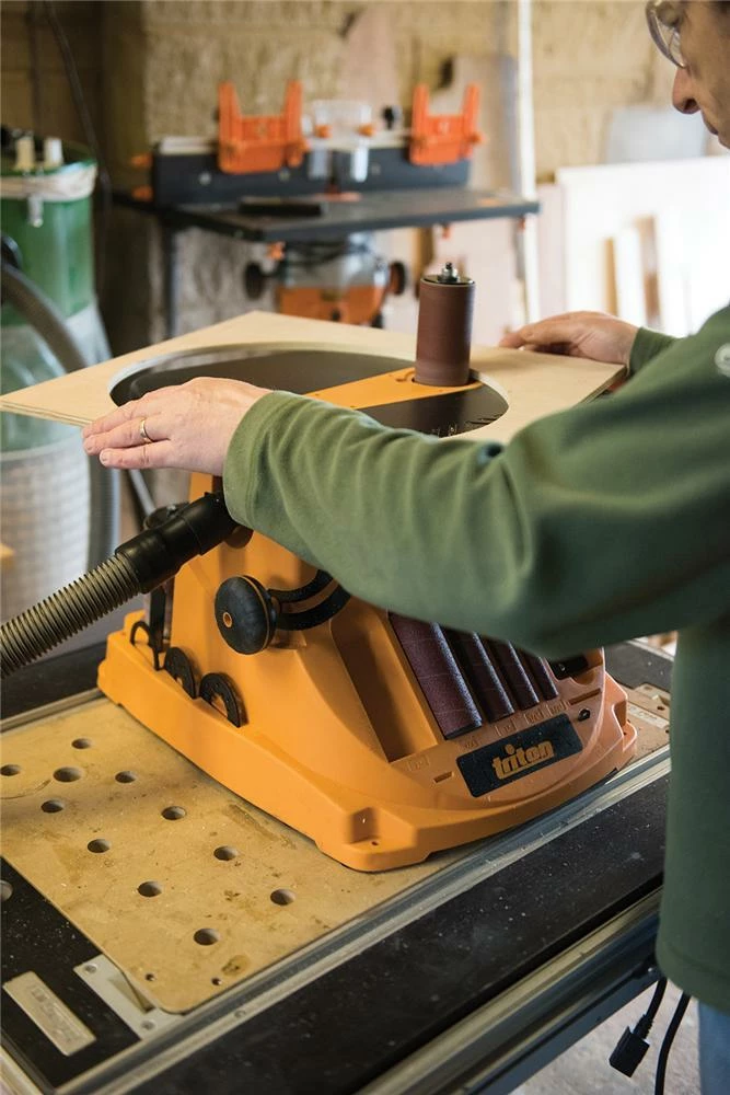 Rangement intégré pour garder les accessoires à portée de main. Plaques à gorge ventilées et canal d’extraction des poussières sous le plateau. Facile à monter sur un établi ou utilisation transportable. Interrupteur de sécurité anti-poussière.