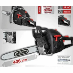 - Tronçonneuse thermique Scheppach CSH46 équipée d’un moteur 2 temps de 46 cm³.